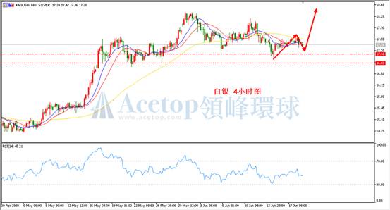 如上图所示,趋势上,当前重点关注16.83,若跌破16.83,后续白银将由多头转为空头,在当前未跌破之前,白银偏向震荡上涨。目前,在日线周期中存在底分型,若白银价格不跌破昨日低点16.94,将有机会走单边上涨。指标上,4小时周期MA13均线、MA21均线和MA72均线相互交织,建议投资者可关注RSI指标,等待RSI指标位于30附近再考虑多单。参考支撑17.23、17.00;参考阻力17.73、17.93。