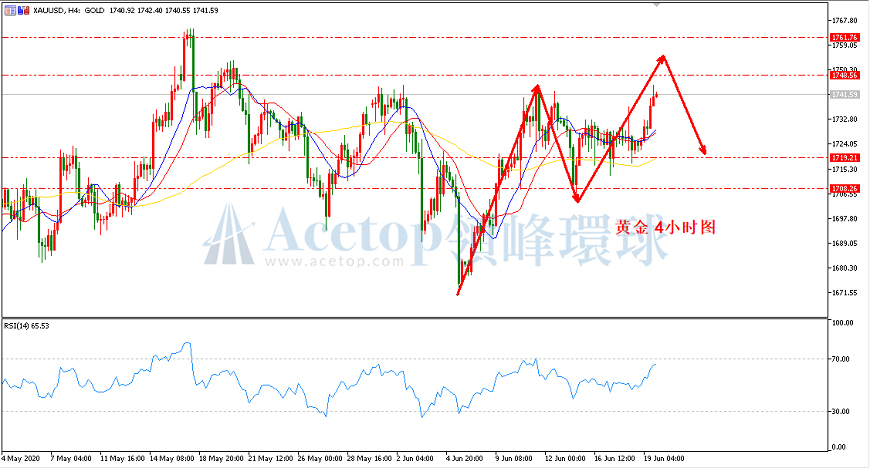 如上图所示,在上6月11日金价上冲1745一线后,横盘一周有余,终于在上周五再次回到1745一线。从当前4小时走势判断,金价上涨至1755阻力位要防止其转跌。指标上,当前4小时周期RSI已接近70附近的超买区域且当前金价已经上攻至1755,在RSI指标超买状态下,极有可能出现较大回落。参考阻力1755、1760;参考支撑:1736、1729。