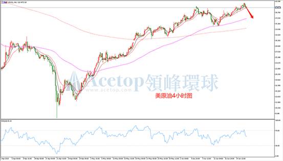 从上图美原油4小时周期走势图来看,美原油目前处于上升趋势,从均线来看,美原油站在了MA5,MA10,MA60,MA200之上,并且已经创出年内新高至41.5附近。但从RSI指标来看,指标价格再度进入了超买区域,并且出现了背离迹象,预计短期美原油会先行回落,下方支撑位可关注在37附近,建议美原油以空头思路对待。