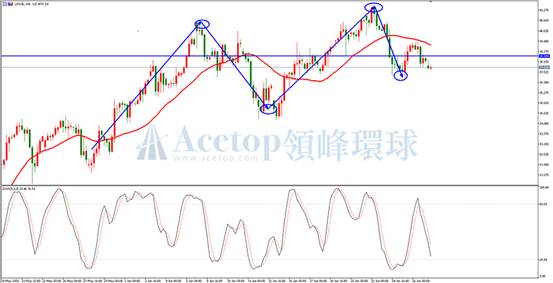 美原油一小时周期来看,油价始终围绕着38.50一线做上下震荡。多头在整个趋势当中略微占上风。整体的结构形态呈高低点缓慢上移,但这并不意味着原油将会持续上涨。且目前4小时周期,Stoch指标已经向下发散,价格也走到了多空线下方,处于空头区间。目前短周期已经处于相对的低位,短线操作者可以尝试在低位布局一些反弹的多单,抢小周期的触底反弹。