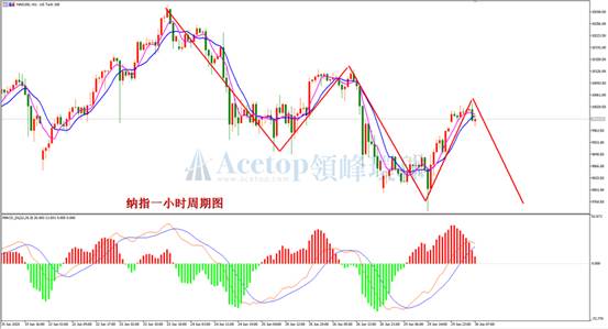纳斯达克指数昨日早间开盘后,继续下行创出新低,价格最低跌至9741附近出现止跌,其后多头大举反弹。从走势上看,一小时图上的下跌趋势正在运行中,昨日上涨属于下跌反弹性质。指标上,MACD快慢线DIFF和DEA即将出现死叉,红色动能柱逐步缩短,上涨动力已经衰竭。日内交易上,建议选择高位做空的思路进行操作。