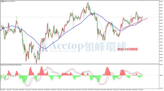 从美原油日线走势图看,K线持续在均线上方运行,波动空间较小,整体上呈弱势上升趋势的走势,偏多,无反转迹象。如上图为一小时走势图,近期高低点不断上移,低点反复受支撑于MA60均线,多头趋势明确。昨天原油反弹高点MACD虽然有顶背离信号,但回调动能较弱,目前,MACD再次接近零轴,调整有到位迹象。日内操作上建议关注小时图MA60均线的支撑作用,可逢低布局多单。