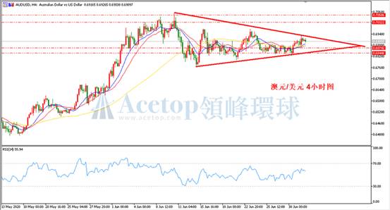 昨日周三,美指小幅下跌,但非美货币的涨幅却不小。原定于北京时间周五(7月3日)20:30公布的美国6月季调后非农就业人口变动和失业率,因美国独立日假期提前至今天晚上20:30公布。市场投资者普遍预计,美国6月非农就业岗位增加300万个,较5月份的250.9万继续回升;预计失业率为12.3%,略低于前值的13.3%。美国就业和失业一直是美联储政策和美国经济关注重点数据,若今天晚上公布的数据符合预期,将提振投资者对于美国经济复苏的乐观前景。