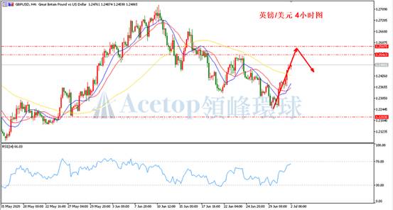 回顾昨日镑美走势,最高录得1.2489,最低录得1.2358,日线收阳,日内上涨逾130点。方向上,先涨后跌的概率较大。