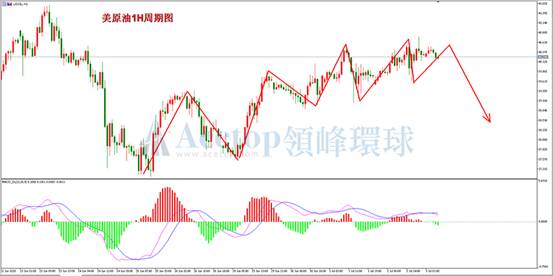 从美原油1H周期走势结构看,行情处在震荡上行的走势结构当中,高低位呈现不断上移,多头结构未改变。但配合MACD动能状态来看,可以观察出,行情在上行的过程中,MACD红色动能柱呈现逐渐缩量的现象,预示行情在上行的过程中,多头动能出现逐步放缓的信号,随着多头动能的缩量,行情距离筑顶的概率越来越大,也预示着空头机会的来临。策略上建议逢高布局空单为主。
