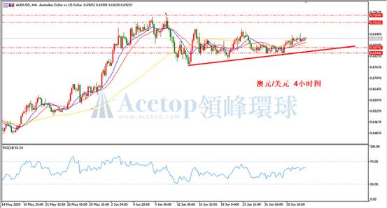 回顾澳美昨日价格走势,最高录得0.6951,最低录得0.6900,日线收阳。截止昨日,澳美已连涨4个交易日,方向上,日内震荡偏涨。