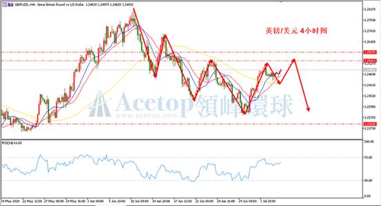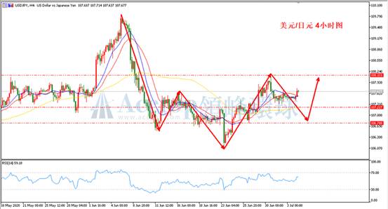 在美日4小时周期中,不难发现自106.06的上涨基本处于停滞状态,上涨动力显然不足。市场在突破108.10后横盘已经四个交易日,当前关键位108.47,若日内上涨不突破108.47,美日后续看空为主。RSI指标上目前接近70附近的超买区,建议投资者等待价格反弹至108.05至108.20区域考虑空单。