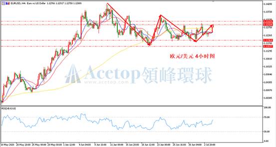 如上图所示,在镑美4小时周期中,上周四上涨突破1.2495,改变了自1.2811的下跌趋势,从趋势的角度判断,镑美还缺少诱空。指标上,目前镑美已站稳MA13均线和MA21均线,两条均线也已形成金叉,预示着诱空后偏涨。MA72均线也由下跌正在逐渐走平,指标上看涨。不过短期需注意RSI指标已接近70附近,且市场缺少诱空,防止市场调整,勿要在当前价格直接布局多单,下跌至1.2380-1.2350区域方可考虑多单。