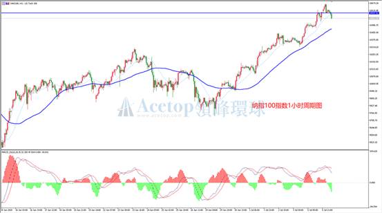 纳斯达克指数昨天晚间在创出新高后,MACD指标的多头动能柱并未同步创出新高,呈现顶背离特征。如上图为一小时周期图,MACD指标同步出现红色动能柱的顶背离信号,存在见顶可能。形态方面,今天出现长阴破位,单根阴线下穿前期4根K线的空间,下跌动能较强,目前仍然在继续回落。如图水平划线,为前期高点重叠的成交密集区,压力较大,故今日策略建议反弹至此位置附近以做空为主。