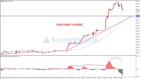 从上图华夏A50指数日线图来看,华夏A50指数在6连阳之后,今天终于开始有所回调,但目前回落空间仍然较小,今天下跌空间不足昨天阳线的三分之一。如下图为1小时周期,MACD在价格创出新高时,指标也同步新高,上升趋势没有结束信号。同时,前期上涨过程中的低点连接形成上升趋势线,目前K线距离支撑较远,短线有继续回落的需要,但就趋势而言,仍然建议以逢低做多为主。操作上,图中水平线是前期成交密集区支撑,今日策略建议回调做多。