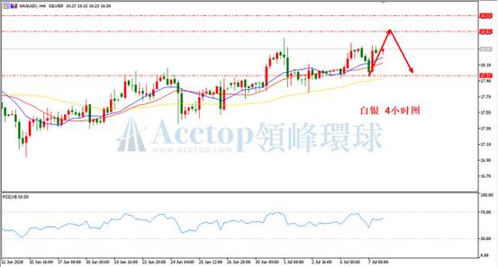 如上图所示,指标上当前白银依然位于MA13均线和MA21均线上方,不过白银并未离均线太远,基本围绕着均线上涨的,而MA72均线也贴近着MA13均线和MA21均线,虽然当前均线指标并无空头信号。不过,在趋势上白银却有转跌的迹象,因为白银自11.62的上涨趋势早已经改变,并且也已经诱多至前期高点了,从这一点来说,白银过前期高点后至少存在一次深度调整,但目前并未发生,那么在其诱多不过极限点的情况下存在一次深度调整的概率就相对偏大,故而偏向空头。参考阻力18.52、18.72;参考支撑18.00、17.80。