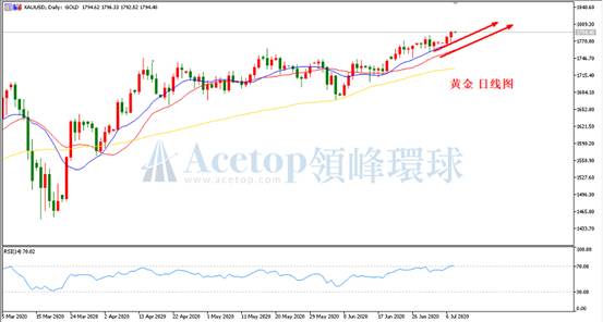 如图所示,在黄金日线周期中,金价的上涨一直受MA13均线的支撑,每当市场回踩MA13均线后均得以反弹,昨日在MA13的支撑下更是一度上涨近25美元。从趋势的角度分析,黄金的上涨暂未见顶,这意味着低多依旧是主思路。不过需提醒的是在黄金快速拉升的同时要重视它可能是赶顶,尤其是日线周期中当前RSI指标已经处于70上方并且存在顶背离,这种情况下黄金极有可能冲高一波便展开深度回调。参考阻力1800、1832;参考支撑1780、1770。