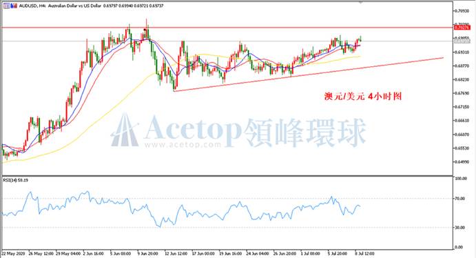如上图画线所示,在澳美4小时周期中,价格不断沿着趋势线抬高,而上涨依然受到前期成交密集区的阻力压制。趋势上,当前关注0.7040,上涨只要不突破0.7040,后续走势将转为下跌或拉大震荡区间。指标上,建议重点关注4小时周期RSI指标,若指标出现在70附近,大胆尝试做空;若RSI处于35下方,可尝试做多。参考阻力0.7010、0.7040;参考支撑0.6945、0.6915。