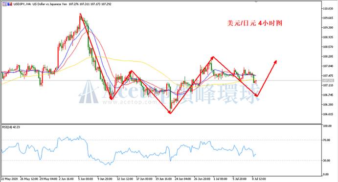 如上图所示,在近期文章的画线中,基本都如上图所示,是因为美日在形态上极大的可能性是走头肩底形态。6月11日形成的低点为左肩,近期的横盘下跌将有机会走右肩的低点,当前关注106.78、106.55一线支撑,美日有较大的概率下跌至这两个支撑位再形成反弹。4小时均线指标暂时体现的是震荡,无参考意义,重点关注K线形态及成交的密集区域。参考阻力107.55、107.85;参考支撑106.78、106.55。
