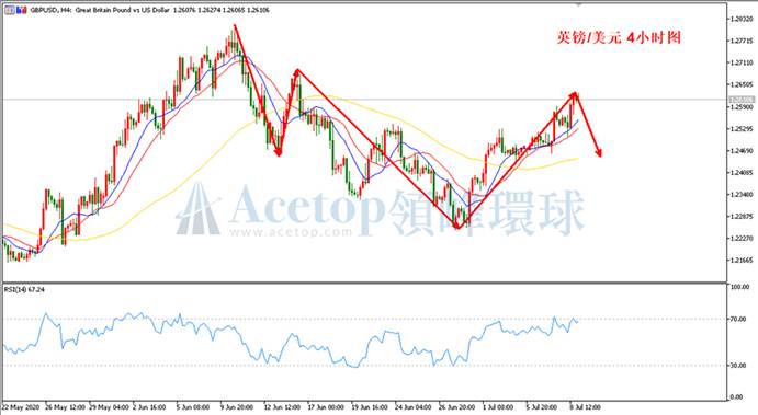 如上图所示,在镑美4小时周期中,当前价格已站稳MA13均线和MA21均线,两条均线也呈现多头排列,MA72均线由此前的走平展开为上涨,从均线指标中可判断出方向偏上涨的概率更大。不过作为日内行情,当前镑美正受到1.2620-1.2635一线阻力,若不能进一步突破,日内镑美将回归到MA21均线甚至是MA72均线支撑位。RSI指标当前处于70附近,在RSI指标处于超买状态下,价格回归MA21均线支撑可能性加大。参考阻力1.2620、1.2650;参考支撑1.2525、1.2470。