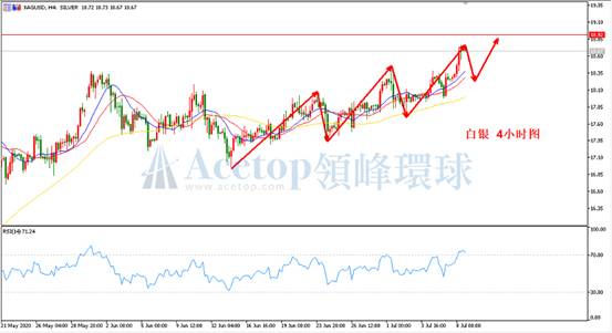 数据显示,美国至7月4日当周初请失业金人数前值为142.7万人,市场预期减少至137.5万人。从上周大非农和此前公布的一系列数据来看,这个预期也是符合美国当下情况的,虽然因为公共卫生事件导致美国许多公民暂时失去了工作,但美国政府采取的一系列解封措施和救助措施还是帮助了不少的人重返工作岗位,这也使得市场对本次初请失业金人数的预期是减少而非增加,但即便如此,130多万人申请失业补助金以及累计申领的人数依然是一个可怕的数据。同样,这也是为什么近期美国多项重要经济数据都是利多美元但美元却迟迟未能上涨的原因之一。无疑,美国经济的实际情况并不太好,宏观上这并不利于美元的上涨,同时也在一定程度上支撑着金银居高不下。