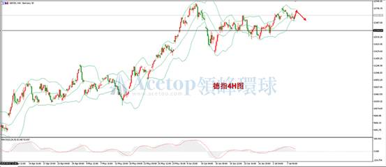 从上图德指四小时周期图来看,布林带近期三轨走平,呈现明显的震荡格局,在此情况下,布林带上轨形成压力,布林带下轨形成支撑;从MACD指标上看,上升动能柱不断缩短,快慢线在0轴上方形成死叉,预示后市有较高概率走空头走势。建议日内投资者采取做空的思路进行操作,空单入场位置可以参考12800区间,该区间是布林带上轨有较大压力。
