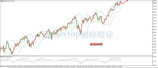 纳斯达克指数四小时图形上来看,近期指数沿着布林带中轨上行,不断创出新高,是明显的多头走势,从MACD指标上来看,目前尚未出现明显的背离信号,说明后市有较高概率延续多头走势;从日线图形上看,目前也在布林带中轨上方,且MACD指标上上升动能柱不断延长,是明确的多头信号。建议日内投资者采取做多的思路进行操作,多单入场位置可以参考四小时布林带中轨,该区间有较强的支撑。