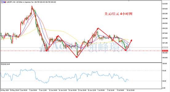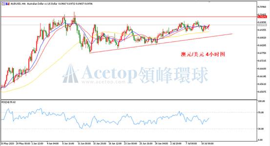 如上图画线所示,在澳美4小时周期中,价格不断沿着趋势线抬高,而上涨依然受到前期成交密集区的阻力压制。趋势上,当前关注0.7040,上涨只要不突破0.7040,后续走势将转为下跌或拉大震荡区间。指标上,建议重点关注4小时周期RSI指标,若RSI位于70附近,大胆尝试做空;若RSI处于35下方,可尝试做多。参考阻力0.6992、0.7030,参考支撑0.6953、0.6938。