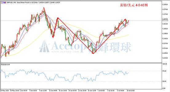 如上图所示,在欧美4小时图中我们依然可见当前价格并未摆脱震荡格局,上涨与下跌趋势也未能形成,这就导致当前大的格局依然是震荡,但就日内而言,短期震荡偏上涨,上涨预期目标位1.1365至1.1400区域。指标上,目前价格已站稳MA13均线和MA21均线,从目前走势来看,多头依然占据优势,建议投资者参考均线支撑布局多单。参考支撑1.1290、1.1260;参考阻力1.1365、1.1410。