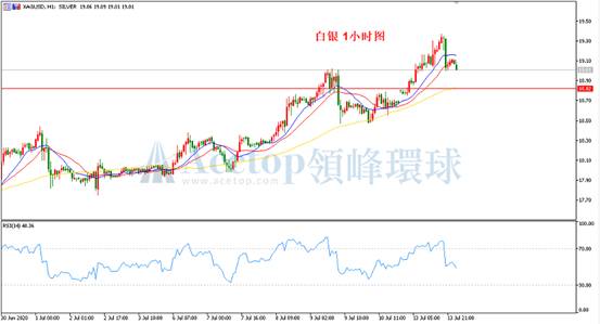 如上图所示,在白银1小时周期中当前价格已跌破MA13均线和MA21均线的支撑,目前正朝MA72均线靠近。当前市场在一段上涨的行情中出现看跌的孕线形态,从其形态判断,预期日内偏空。趋势上,重点关注19.30,若反弹不再超过19.30,有较大的机会走单边的下跌。建议投资者等待价格反弹到MA13均线和MA21均线的阻力位置再考虑布局空单。