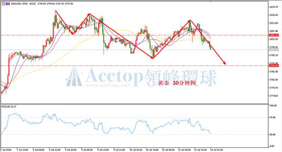 如上图所示,在黄金30分钟周期中自目前高点的下跌趋势已经形成,趋势上,下跌需关注1786,若跌破1786,确定30分钟下跌趋势在延续,同时也代表着4小时周期的下跌趋势形成。反之,若今日乃至本周不能跌破1786,黄金仍会处于高位震荡。指标上,当前金价跌破MA13均线、MA21均线和MA72均线,且三条均线有空头排列迹象,从指标上看偏向空头。预期日内下跌至1792至1786区域。