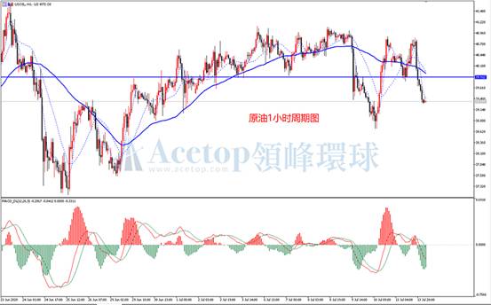 美原油昨天冲高回落,日线收阴,吞没前一天阳线实体,短线偏空。如上图为1小时周期,原油昨天冲高受阻于40.80附近的高点平台,随后倒V型反转下跌,下跌动能较强。如图划线为前期高低点反复重叠的密集区,具备较强支撑,昨天跌破此位置之后转为强压力位。同时,此位置与MA60均线接近,进一步增加了压力作用。日内操作方面,建议依托此压力位,等待反弹做空。