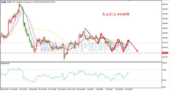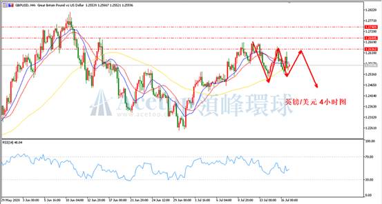 如上图所示,在镑美4小时周期中,以6月29日的低点1.2250为起点的上涨趋势本周三已经改变,目前诱多遇到1.2636的阻力形成短期的回撤。从目前走势来看,回撤后再次上涨突破前期高点的概率较大。指标上,MA13均线和MA21均线仍在MA72均线上方,MA13均线和MA21均线也再次形成金叉,从均线指标判断,镑美日内看涨的概率偏大。参考支撑1.2536、1.2507;参考阻力1.2636、1.2688。