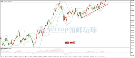 德指四小时周期图形上来看,布林带三轨被向上打开,指数在布林带中轨上方运行,且处于上升通道上方,是明显的多头趋势行情;从MACD指标上来看,上升动能柱不断延长,且未出现背离信号,也是多头信号;从日线形态上看,目前指数也在日线布林带中轨上方运行,且未出现顶分型结构,也预示后市有极高概率延续多头走势。建议日内投资者采取做多的思路进行操作,多单入场位置可以参考12810区间,该区间是四小时布林带中轨,有较强的支撑。