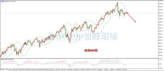 纳斯达克指数四小时周期图形上看,布林带三轨被向下打开,指数跌破布林带中轨且反抽无力,从MACD指标上看,下降动能柱不断伸长,且未出现背离信号,也是空头信号;从日K线形态上看,日线顶分型结构也已经形成,这都预示着后市有极高概率走空头走势。建议日内投资者以做空的思路进行操作,空单入场位置可以参考10700区间,该区间有重要阻力。