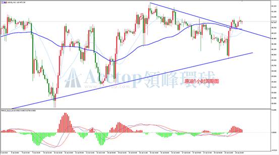 美原油昨天亚欧盘震荡下跌,盘中快速下探,如上图为1小时周期,盘中最低点再次测试前期上升趋势线附近,随后V型反转,吞没全天所有下跌,并且突破前期高点连接形成的下降趋势线。指标上看,目前原油已经重新站上MA60均线,同时,MACD指标也回到零轴上方。更大的4小时周期MACD已经开始金叉向上,建议日内以做多为主,做多点位可等待回调至下方均线支撑附近。