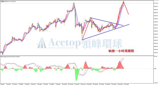 纳斯达克指数一小时周期,在上周经历震荡调整后,最终从低位开始大幅拉升,多头上涨非常强烈,日内早间继续上行,即将再次创出历史新高。从指标上看,MACD快慢线高位即将死叉,红色动能柱已经连续缩短,上涨动能已经出现衰竭,日内将会有回调产生。日内交易上,建议选择高位做空的思路进行操作。