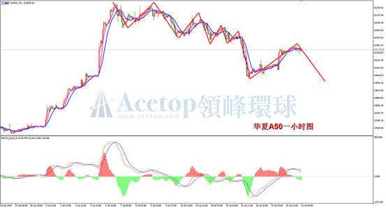华夏A50一小时周期图,昨日从低位开始大幅的反弹,大经历反弹后,下行趋势依然未能改变,日内早间短暂冲高后开始出现回落。从指标上看,一小时MACD快慢线DIFF和DEA已经出现死叉,绿色动能柱开始出现,新的空头动能又开始出现。日内交易上,由于下跌趋势还在时行中,建议逢高布局空单的思路进行操作。