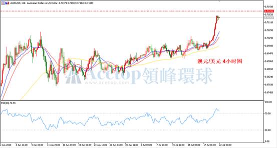 如上图所示,在澳美4小时周期中,当前MA13均线、MA21均线和MA72均线始终保持多头排列状态,回踩均线位布局多单仍是我们的主要思路。日内短期关注邻近4小时K线能否保持单边上涨,当前关键点0.7104,回调不破0.7104即保持4小时周期的单边上涨趋势。由于当前多头依然强势,建议投资者可以以0.7100为止损布局多单。参考支撑0.7100,参考阻力0.7160。