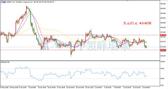 如图所示,在美日4小时周期中,当前价格位于MA13均线和MA21均线下方。虽目前美日仍处于震荡区间内,但MA13均线和MA21均线已再次形成死叉且与MA72均线保持同向下跌,从指标上判断,预期震荡后偏空。但日内若不能跌破震荡区间下轨106.55,那么短期还是偏震荡的可能性大。当前投资者需关注106.55及105.25两个关键位。参考支撑106.55、参考阻力107.15。