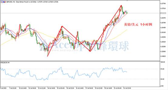 如上图所示,在欧美1小时周期中当前价格位于均线上方,MA13均线、MA21均线与MA72均线呈现多头排列状态,从均线指标判断,欧美仍处于强势的看涨之中,价格回调至均线处仍可布局多单。趋势上,目前较大周期中,如日线和周线都已形成上涨趋势,在大周期的保障下,欧美必定还能再创新高。参考阻力1.1580、1.1620;参考支撑1.1520、1.1490。