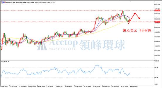 如上图所示,在澳美4小时图中,昨天跌破0.7100意味着邻近以0.6775为起点的上涨趋势改变,日内将有较大概率形成上涨诱多走势。指标上,RSI指标从35附近逐渐向50附近靠近,加上当前澳美价格受到MA13均线和MA21均线的压制,预计日内震荡的概率较大。上方参考阻力0.7182、0.7211;下方参考支撑0.7105、0.7075。