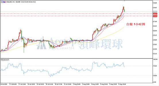 如上图所示,在白银1小时周期中,目前价格仍处于MA13均线和MA21均线上方,当前白银受到30.00关口阻力压制有小幅回落。均线指标上,MA13均线和MA21均线保持着多头排列,回调至均线处仍可尝试多单操作。在上图中,我们可明显的观察到白银价格与RSI指标处于背离之中,鉴于今日有大非农数据的公布,投资者当谨慎对待30.00关口阻力带来的回撤风险。非农数据公布前,建议投资者参考如下建议操作。参考阻力30.00、30.40;参考支撑28.67、28.30。