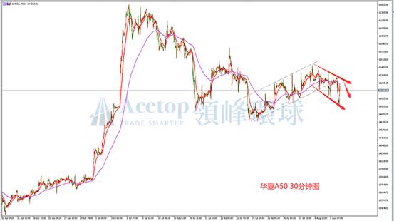 华夏A50指数从30分钟图来看,A50跌破上升趋势线,上升通道被打破,A50反弹结束,A50再次开启空头下跌行情,高点在不断下降,低点也在不断下降,从均线来看,K线与均线,从缠绕状态变为发散向下的状态,A50跌破MA60,MA10,继续向前期低点14800附近靠近,均线与K线呈现空头走向。从日线级别来看虽然A50仍然是多头走势,但是其多头上行力度在逐步转弱,而30分钟A50走势偏空,因此建议投资者逢反弹做空为主。