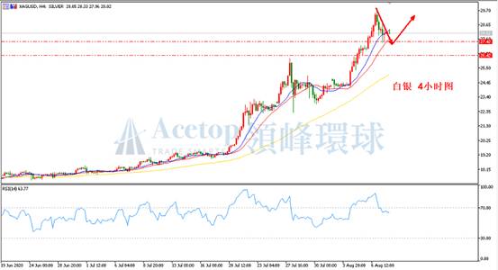 如上图所示,在白银4小时周期中,目前价格从30.00上方下调至当前27.50附近,虽然当前下跌调整幅度比较大,但白银的上涨趋势却始终还没有改变,故而在整体方向上白银依然看涨为主。不过作为日内行情,白银有顺势下跌的可能性,当前需关注28.87,若反弹不突破28.87,白银将有较大概率下跌至26.42附近。指标上,价格已跌穿MA13均线,当前MA13均线构成阻力且RSI指标也处于70超买区域附近,美盘前有望先顺势下调。参考阻力:28.20、28.87;参考支撑27.10、26.42。