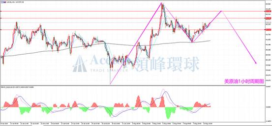 从上图美原油1小时周期图看,昨天美原油选择震荡上行,从43.59以来的下跌到目前其实原油都只是走宽幅震荡,并且整个震荡调整行情远远没有结束,目前是向上一笔反弹走势;另外,从均线角度来看,价格在长期均线上方止跌并展开反击,短中期均线呈多头发散状态,说明今天日内短线美原油还会继续上行,但上方42.68、43.08左右是重要的压力位,所以今日操作方面可以采取轻仓逢低做多的策略。