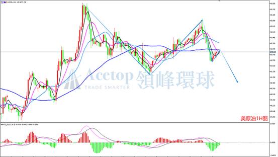 原油昨日在亚欧盘时段小幅上涨,在涨至43.07附近后遇阻回落,美盘时段最低跌至41.67附近。从1H周期走势结构看,原油自41.21附近上涨,没能涨破前期高点,在涨至43.07附近后下跌,目前短期均线已形成死叉,进入空头趋势,日内操作可关注空单机会。结合MACD指标来看,原油自41.21附近上涨,虽然价格不断上行,但MACD指标红色能量柱却在逐渐缩小表明多头力量不足,后市大概率延续下跌。