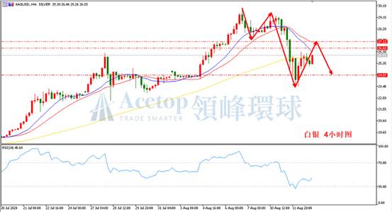 如图所示,在白银4小时周期中,当前的下跌趋势已经形成,当前价格处于4小时下跌趋势的初期阶段,在此阶段中预期偏向宽幅震荡,若从昨日低点的反弹不到28.70,4小时下跌趋势仍延续。指标上,MA13均线和MA21均线已经形成死叉,反弹到均线阻力位置可尝试布局空单。参考阻力点26.60、27.13;参考支撑24.37、24.00。建议投资者在26.60至24.37区间高抛低吸。