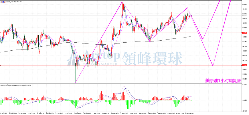从上图美原油1小时周期图看,昨天的EIA利好都未能带动原油价格拉升,表明原油当下拉升的条件不具备还需要调整。由上图走势可以看出,价格已两次在43附近裹足不前说明此处压力极大,虽然短中期均线是多头排列,而且下方MACD指标也处在0轴上方,该涨不涨就会大概率出现震荡行情,不过,这次的震荡空间可能会较大,预计在43.1-41.3(极端情况可能会是43.1-39.9),所以今日操作方面建议逢高做空较好。