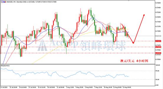 如图所示,昨日文中提到0.7190附近的空单策略若有持仓在0.7122附近考虑出局。在澳美4小时周期中,邻近的4小时下跌趋势昨日已经改变节奏,自昨日高点的下跌为4小时诱空走势,预期诱空至0.7122附近,诱空后看涨。日内方向上,震荡看涨。指标上,MA13均线、MA21均线和MA72均线相互交织,体现出震荡,而RSI指标在近几个交易中也始终在30-70区间内运行,并无超买超卖现象出现。建议投资者按照下方策略短线操作。
