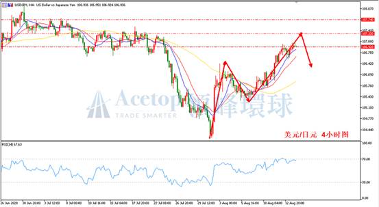 如上图所示,虽然美日在本周三已经形成4小时级别上涨趋势,但投资者需谨记一点,无回调不追多。因为4小时上涨趋势虽形成,但同时面临着日线级别的压制且当前已进入日线级别的阻力区。106.54和107.32是邻近的支撑和阻力点,预期日内将在106.54至107.32区间震荡。指标上,4小时MA13均线、MA21均线和MA72均线呈现多头排列,短期信号看涨,但在强压力下不排除跌破MA13均线和MA21均线支撑的可能。