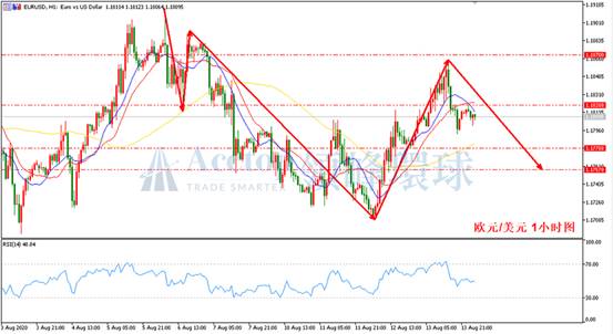 如上图所示,昨日欧美最高上涨至1.1863,接近1小时下跌趋势节奏阻力点1.1870但并未突破,其后转为下跌。截止当前,欧美已跌破MA13均线和MA21均线的支撑,预期将跌至1.1778至1.1757区间。趋势上,当前1小时下跌趋势依然保持,而从目前低点1.1710为起点的上涨仅是单边走势,从这两方面可判断在接下来的交易日中欧美再度跌破1.1710的概率极大。指标上,MA13均线和MA21均线已形成死叉,同样支持价格下跌。参考阻力1.1820、1.1850;参考支撑1.1778、1.1757。