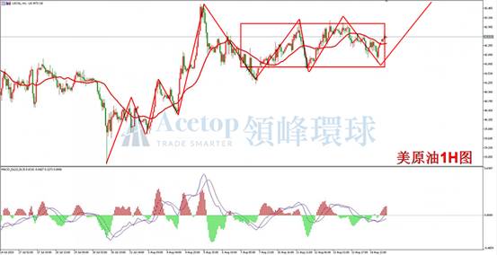 原油上周五早间开盘后,价格不断震荡走低,晚间最低跌至41.90附近出现止跌,其后展开反弹。从走势上看,连续几日多头来回博弈,在一小时周期图上形成了标准的盘整区间。指标上,一小时MACD快慢线DIFF和DEA已经出现金叉,红色动能柱正在生长,多头正在上涨中。日内交易上,由于目前属于上涨的整理区间,建议选择继续做多的思路进行操作。