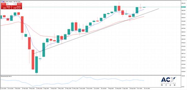 上周五发布的美国9月零售销售月率,以三个月来最快的速度增长,报1.9%,优于分析师预期的0.5%,这表明尽管面对诸多不利因素,第三季度消费者支出还是以反弹收官。同日,辉瑞官网发布了CEO公开信,信中表示,可能在10月底之前知道在研新冠疫苗是否有效。根据目前的试验入组,在11月第三周实现安全里程碑后,辉瑞将在美国申请紧急授权使用。疫苗计划的提前以及第三季度消费支出的利好的消息,让美国股市暂缓了持续四天的下跌趋势。上周五收盘时,美国股指涨跌各异,卡特彼勒和波音领涨道指成分股,大单期权交易拖累科技股。标普500指数收涨0.01%,上周累计上涨0.19%;道琼斯指数收涨0.39%,上周累涨0.07%;纳斯达克指数收跌0.36%,上周累涨0.79%。