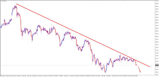 【技术点评】:H4周期,金价依然受制于下降趋势线,本周价格沿趋势线震荡下行。
